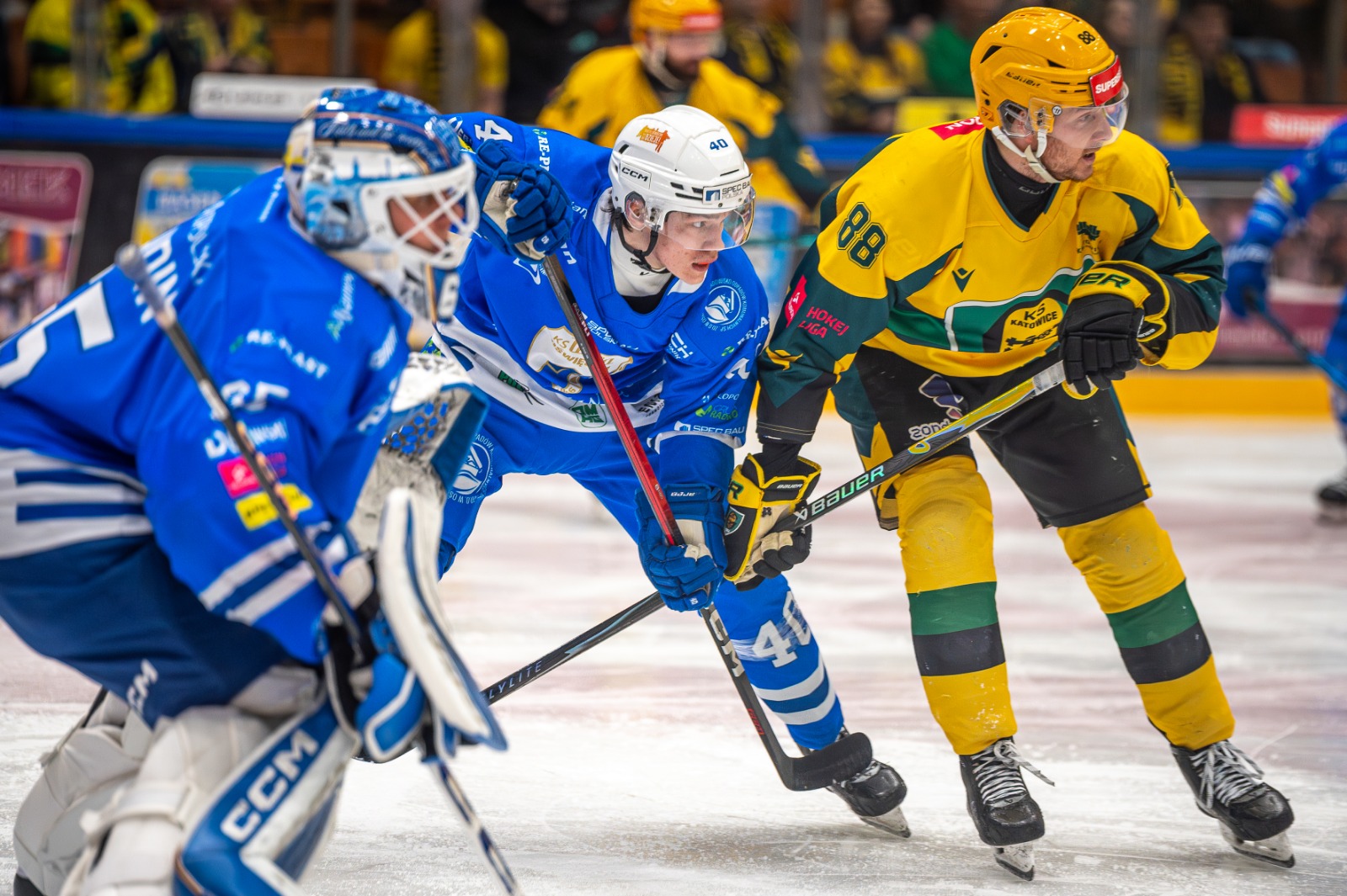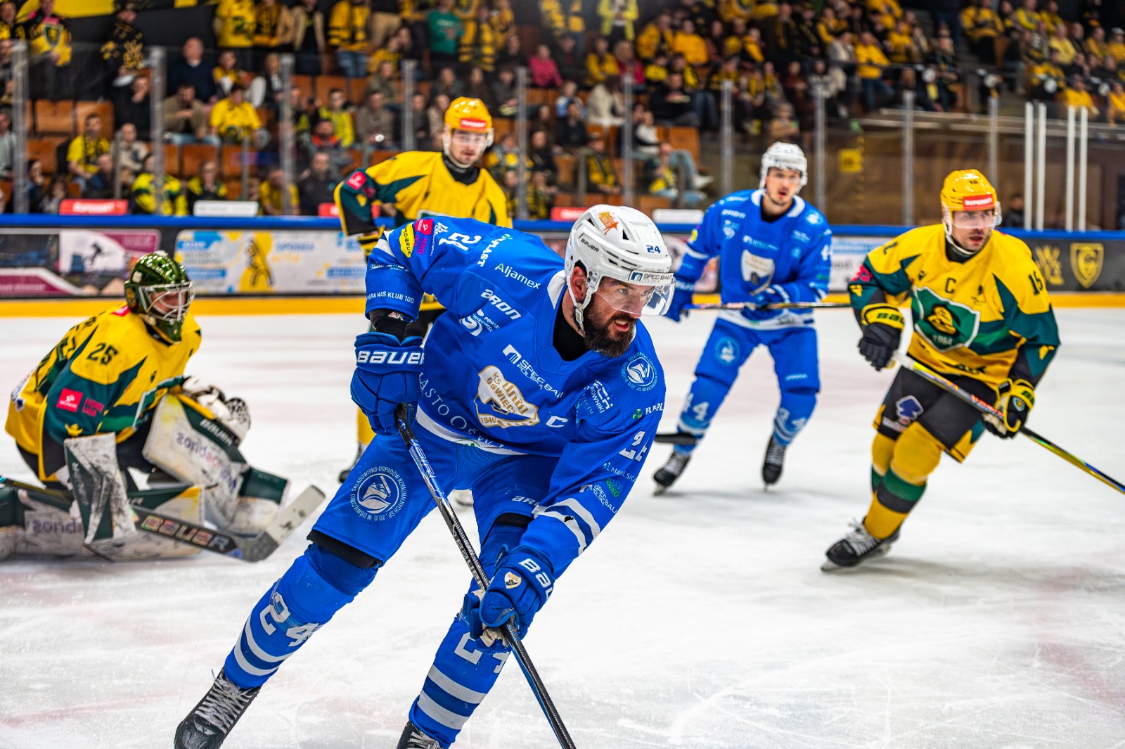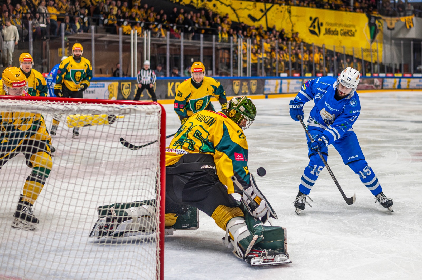 W pierwszym meczu półfinału play-off Unia Oświęcim przegrała na wyjeździe z GKS-em Katowice 3:4. Oto pięć najlepszych ujęć z tego starcia. Autorem fotografii jest Jarosław Fiedor.
