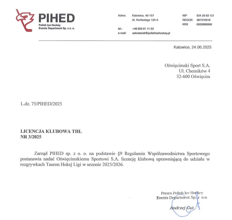 Nasz klub spełnił wszelkie wymogi organizatora rozgrywek i otrzymał stosowny dokument, podpisany przez Andrzeja Guta, prezesa Polish Ice Hockey Events Department Sp. z o.o.