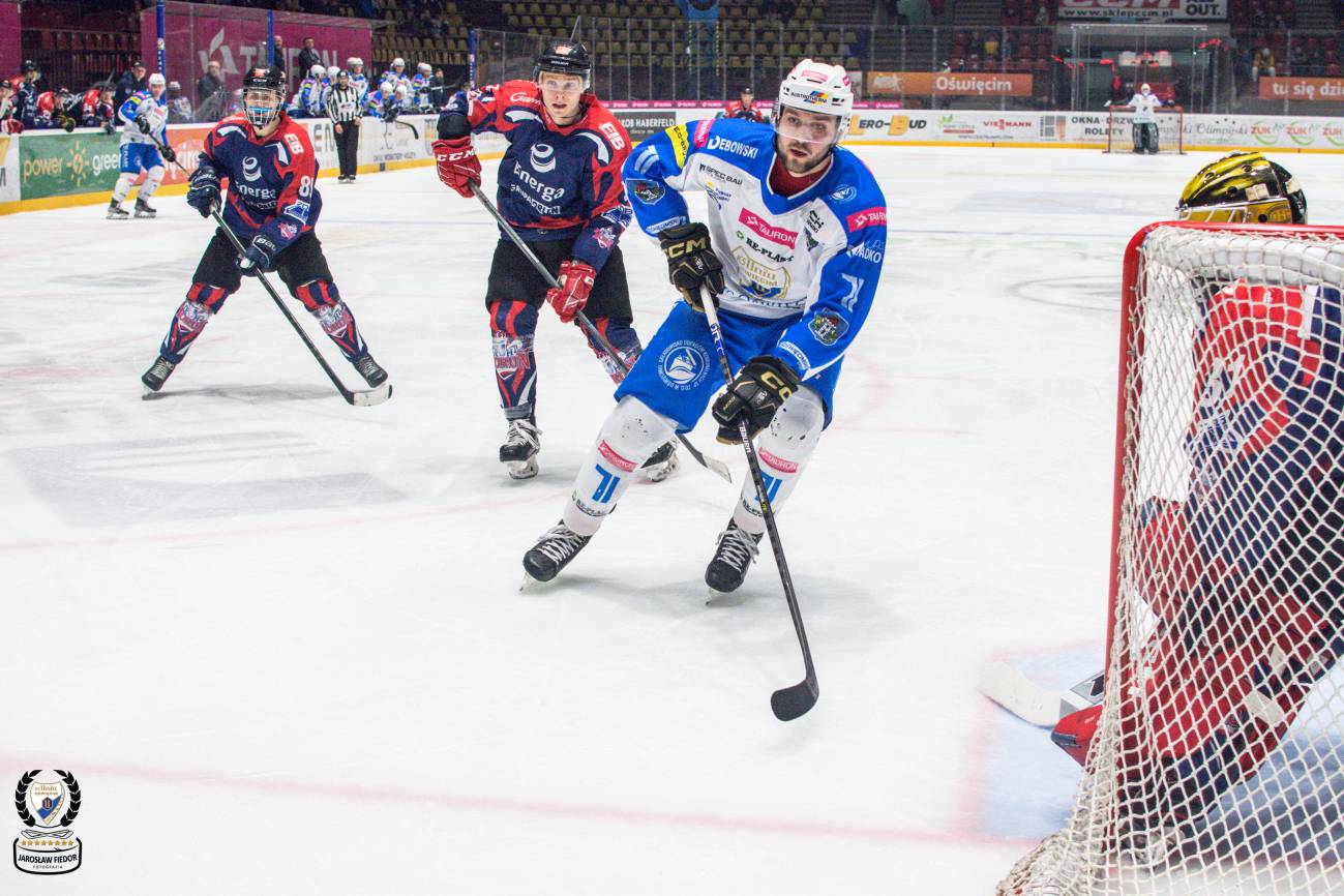 Biało-niebiescy po 13 minutach przegrywali dwiema bramkami. Obie padły wówczas, gdy grali w liczebnym osłabieniu. Podopieczni Krzysztofa Majkowskiego przed zakończeniem pierwszej odsłony zdołali odrobić straty, a na listę strzelców wpisali się Pawło Padakin (sprytna dobitka) i Erik Ahopelto (uderzenie bez przyjęcia z bulika).